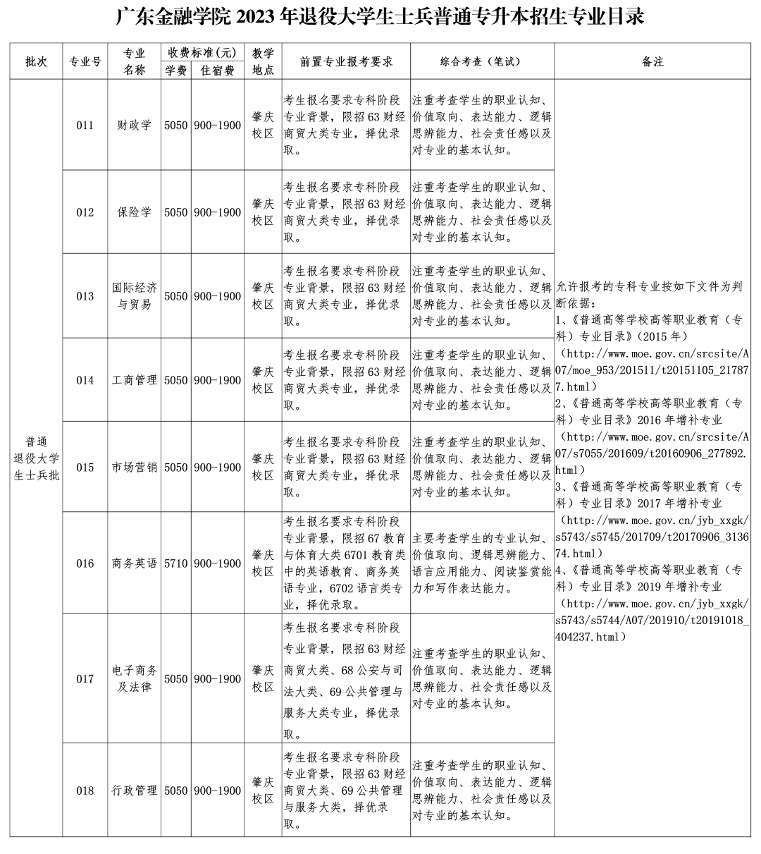 为贯彻落实《关于做好2023年普通高等学校普通专升本考试招生工作的通知》(教学司〔2022〕16号)精神,根据《广东省2023年普通高等学校专升本招生工作规定》(粤招办普〔2022〕52号)、《关于做好广东省2023年普通高等学校专升本免文化课考试招收退役大学生士兵工作的通知》(粤招办普〔2023〕6号)要求,现制定广东金融学院2023年退役大学生士兵普通专升本招生简章。