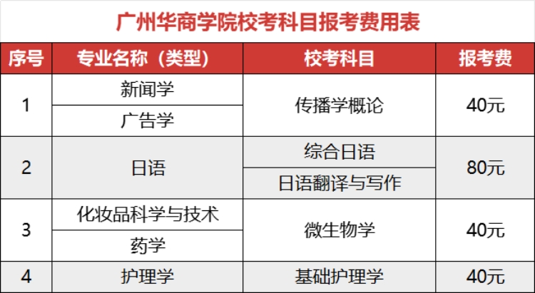 报名考生需交报考费40元/科。省统考科目报考费在报名系统缴交,报考我校自行组织命题科目报考费由我校收取,缴交方式请关注“广州华商学院招生办”公众号相关通知。已成功报名(交费成功)的考生,若个人原因放弃报名,不予退回报考费。
