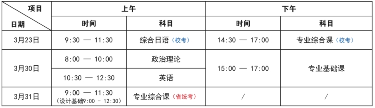 (四)普通专升本招生考试时间为:校考科目3月23日(星期六),统考科目3月30日(星期六)-31日(星期日),具体安排见下表: