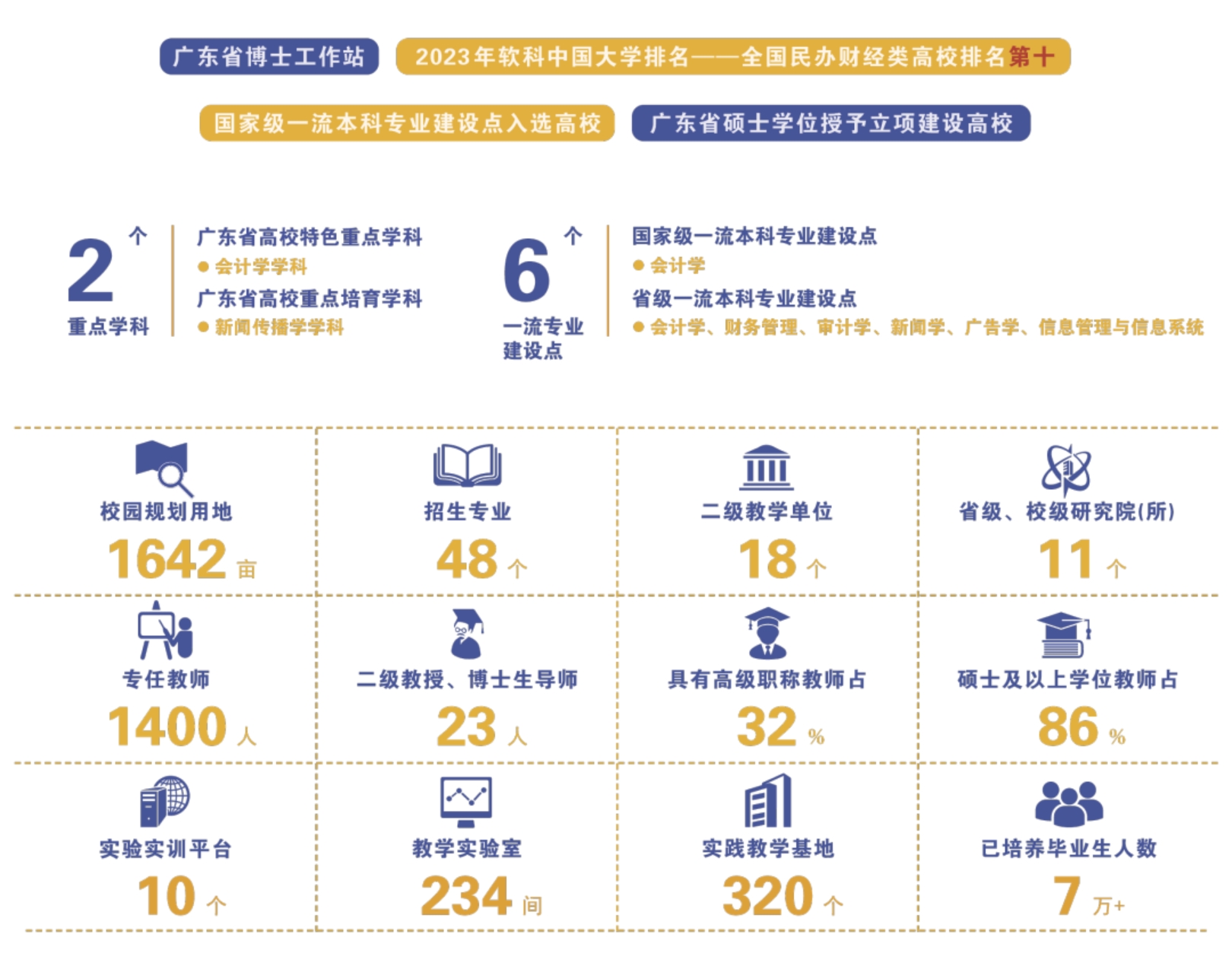学校先后荣获“广东省十佳独立学院”、“中国民办高等教育优秀院校”、“广东省最具就业竞争力独立学院”和“广东省最具综合实力学院”、“中国财经类独立学院排名第3位”等称号。