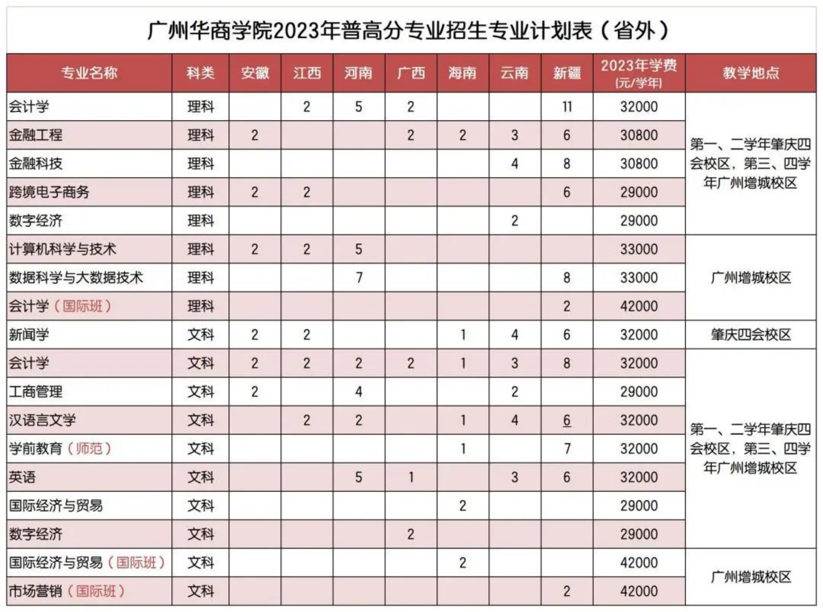 2023年广州华商学院(原广东财经大学华商学院)面向广东、安徽、江西、河南、广西、海南、云南、新疆等8个省区招收普通高考生,招生专业48个,招生计划6300人,其中广东省6126人,省外174人,各省区招生计划详见下表。