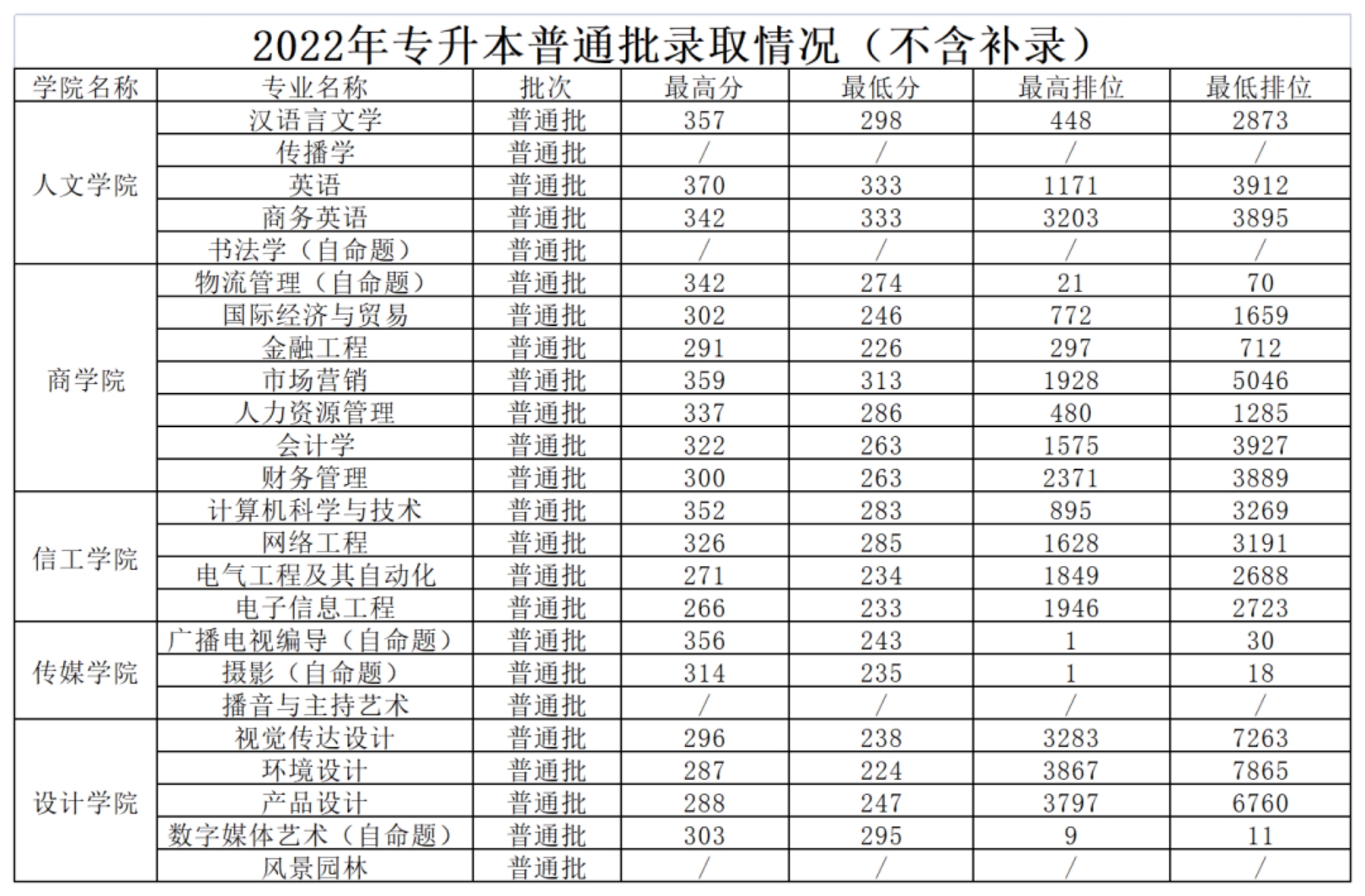 2022年普通专升本(普通批次)各专业录取最低分及排位