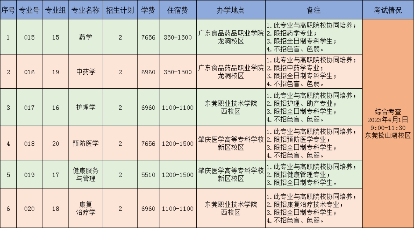 学费:护理学、中药学、康复治疗学专业6960元/年,药学及预防医学专业7656元/年,健康服务与管理专业5510元/年;住宿费按照合作院校收费标准收取,广东食品药品职业学院为350-1500元/年,肇庆医学高等专科学校为1200-1500元/年,东莞职业技术学院为1100元/年。若 2023 年广东省政府有新的收费标准,按新标准执行。