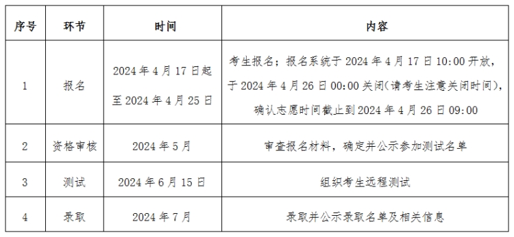 报名时间为2024年4月17日 - 2024年4月25日。报名系统于2024年4月17日10:00开放,于2024年4月26日00:00关闭(请考生注意关闭时间),确认志愿时间截止到2024年4月26日09:00,未确认志愿的考生报名无效。