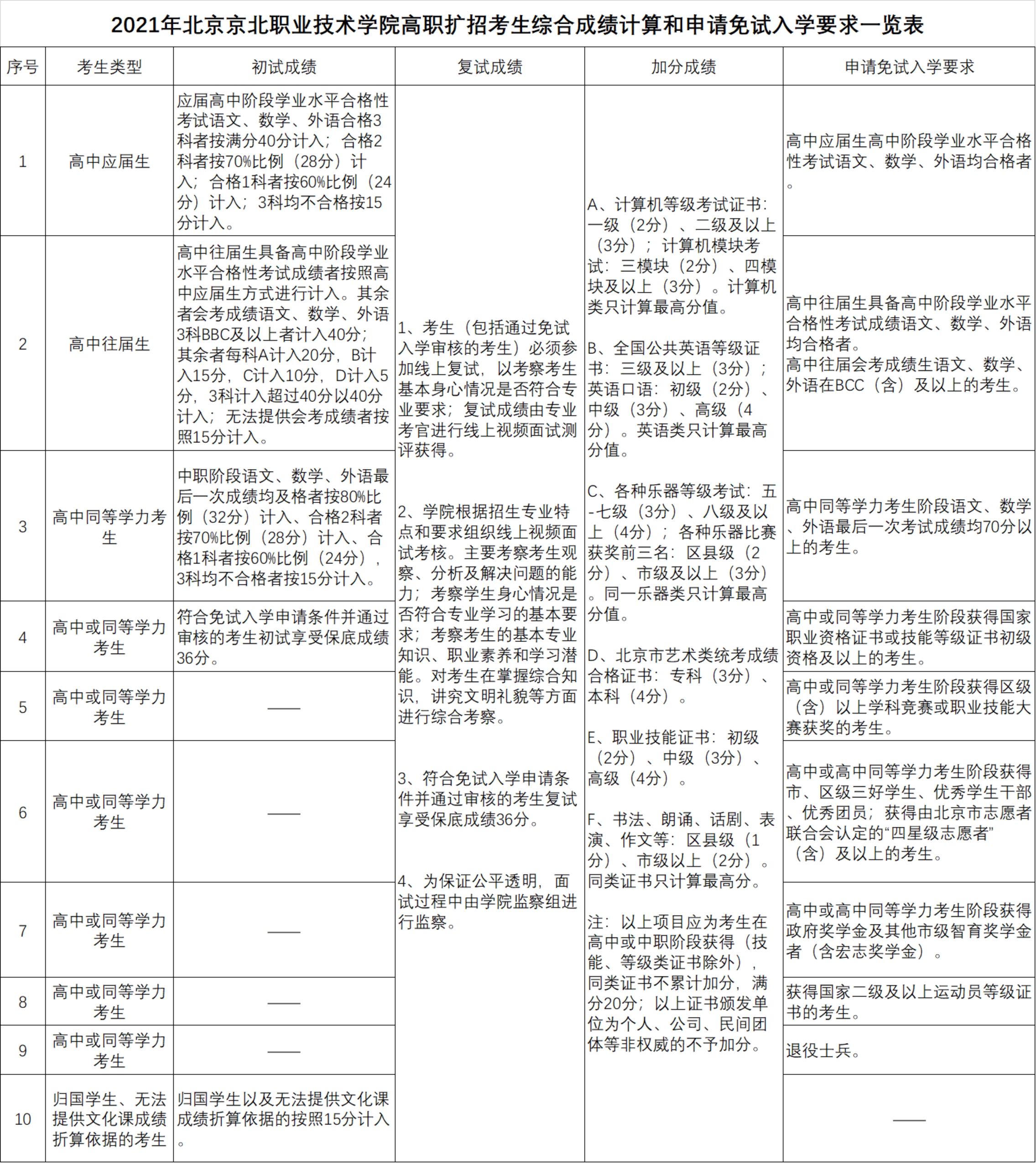 初试成绩、复试成绩、加分成绩计算及免试入学申请条件详见“2021年北京京北职业技术学院高职扩招考生综合成绩计算和免试入学申请要求一览表”。
