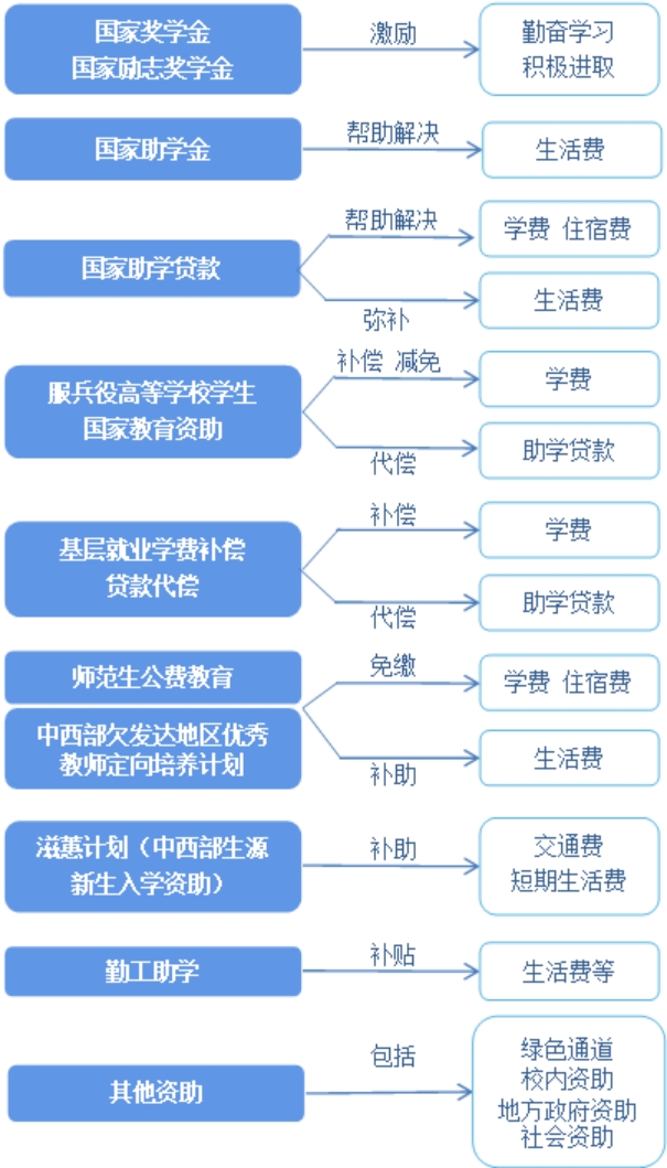 国家在高等教育本专科阶段建立起国家奖学金、国家励志奖学金、国家助学金、国家助学贷款等多种形式有机结合的高校学生资助政策体系。
