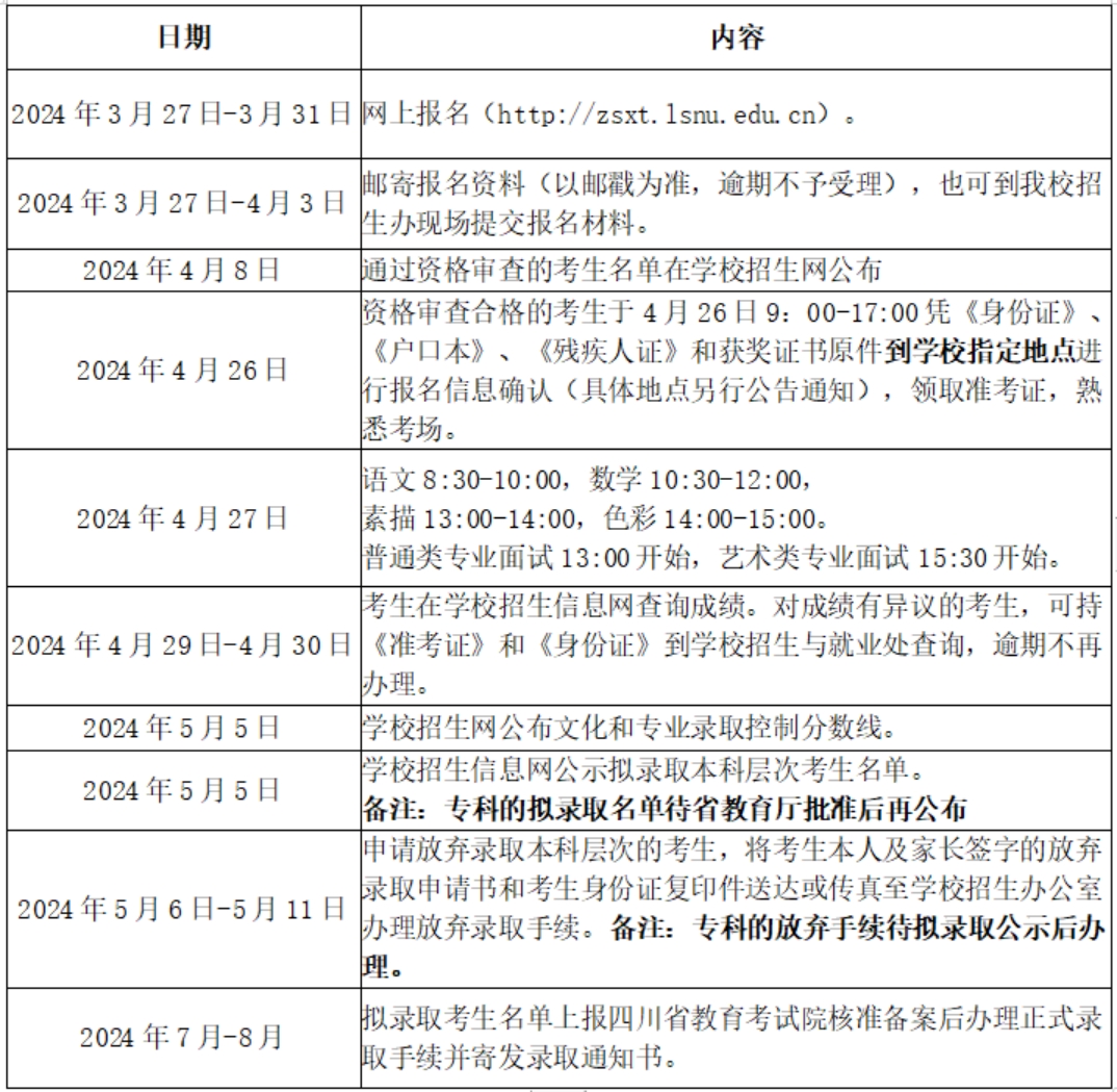 我校将招生简章和考试大纲报省考试院备案后向社会公布,请考生按要求将报名材料在2024年4月3日前(以邮戳为准)现场提交或者通过顺丰、EMS邮政快递邮寄(其余快递有可能不能正常投递,因报名材料不能及时送达导致错过报名时间的,由考生自行负责)到我校招生办公室(邮寄地址:乐山市市中区滨河路778号乐山师范学院招生办公室,联系人:李老师。电话:0833-2276288,邮编:614000),逾期不再受理。