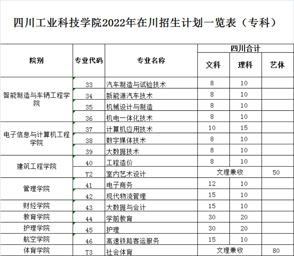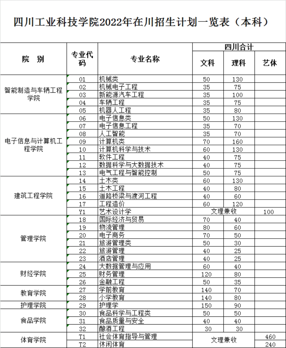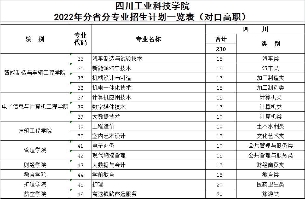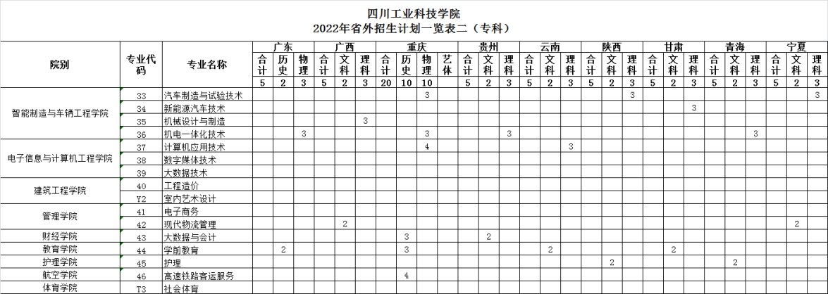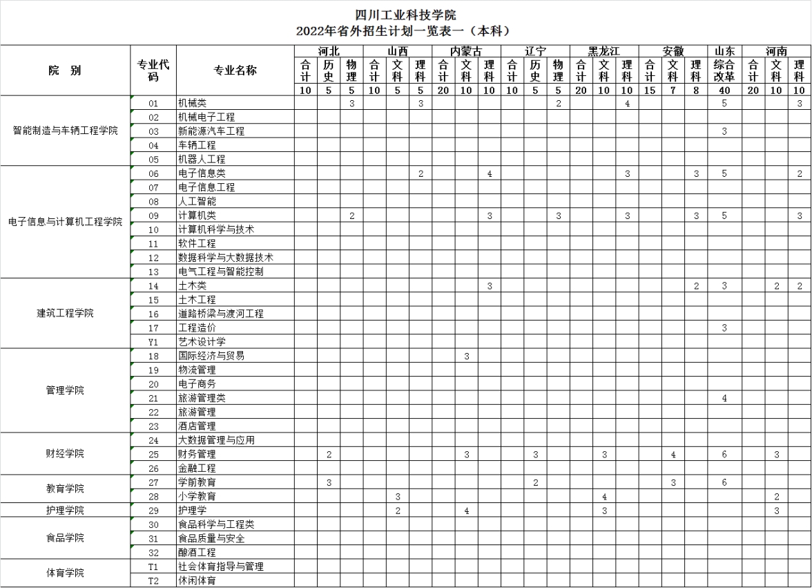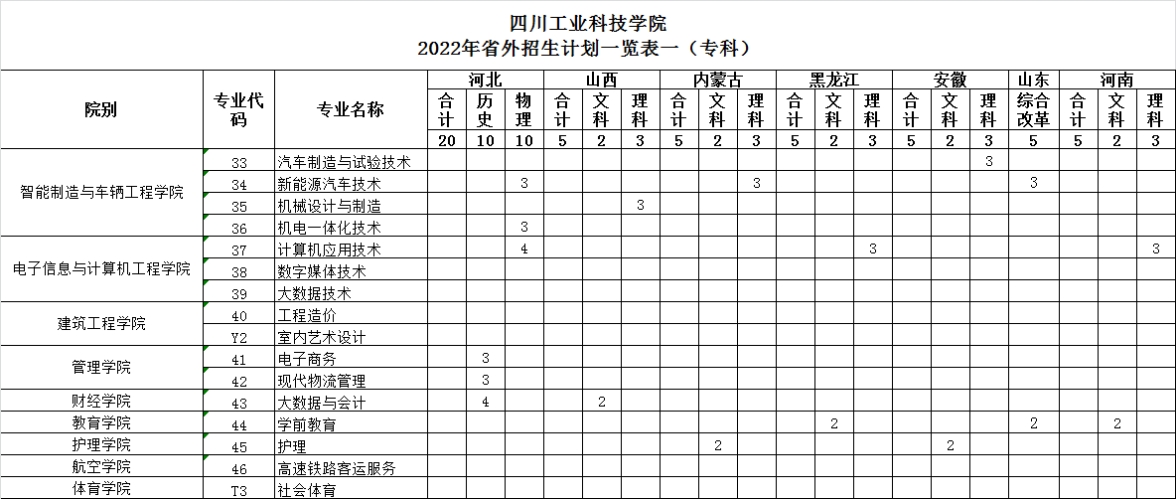 四川工业科技学院2022年在川招生计划一览表(本科)四川工业科技学院2022年在川招生计划一览表(专科)四川工业科技学院2022年分省分专业招生计划一览表(对口高职)四川工业科技学院2022年省外招生计划一览表一(本科)