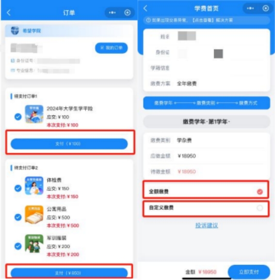 注:缴纳学费可选全额缴费/自定义缴费,有贷款的同学可选择自定义缴费, 缴纳扣减掉贷款后的剩余费用即可。