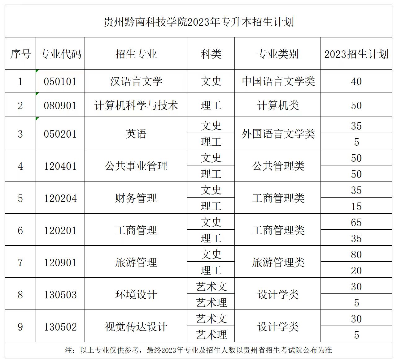 2023年 : 贵州黔南科技学院2023年“专升本”招生计划及专业类对应指导目录