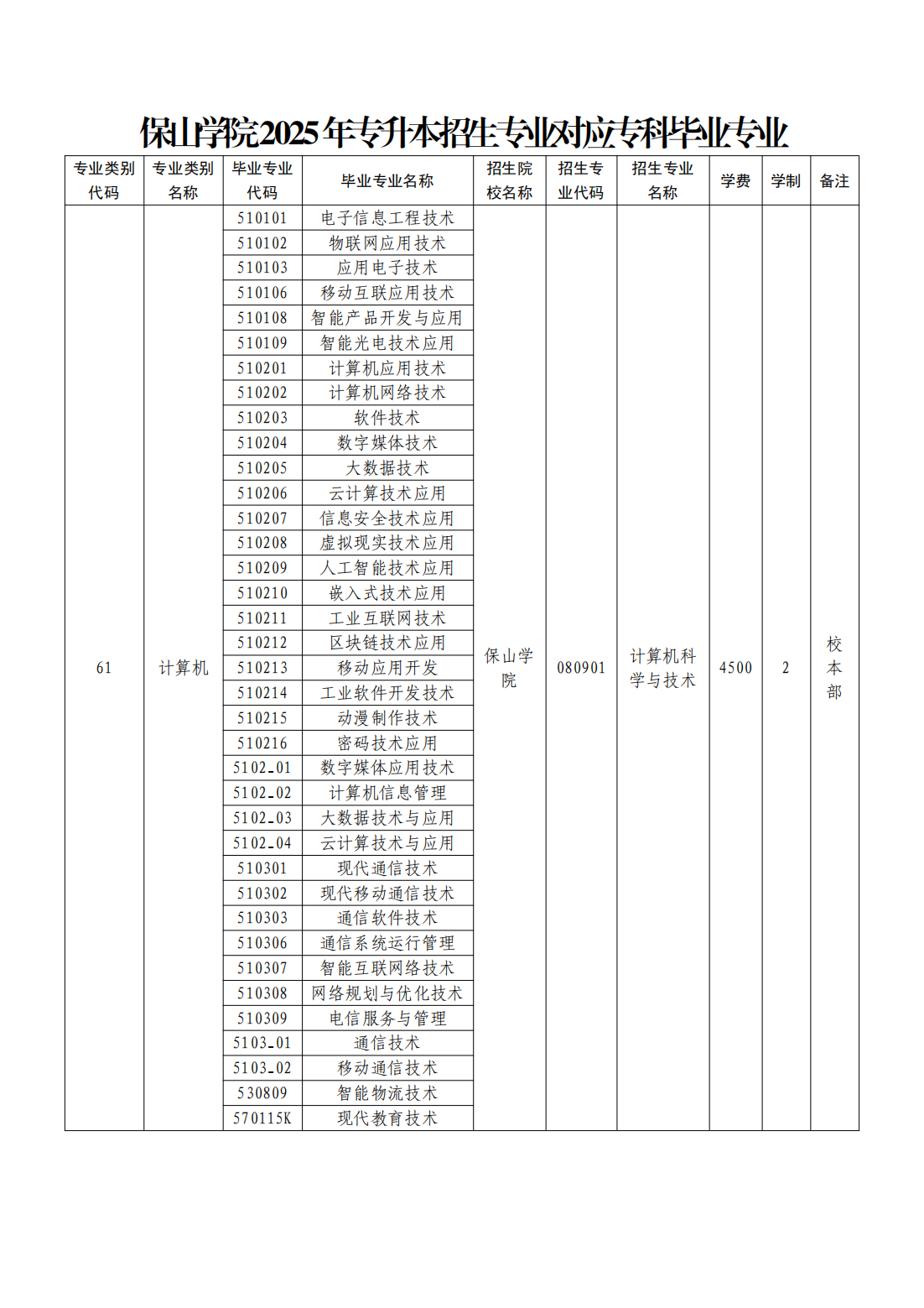 2025年 : 保山学院2025年“专升本”招生专业与专科毕业专业对应关系公示