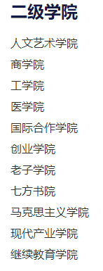 院系设置:人文艺术学院、商学院、工学院、医学院、国际合作学院、创业学院、老子学院、七方书院、马克思主义学院、现代产业学院、继续教育学院等