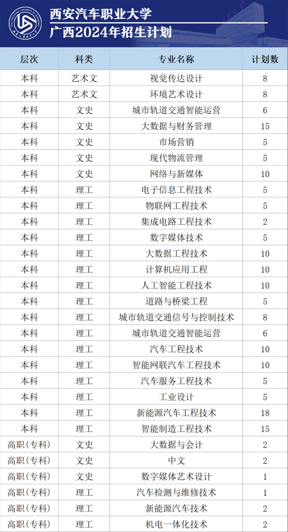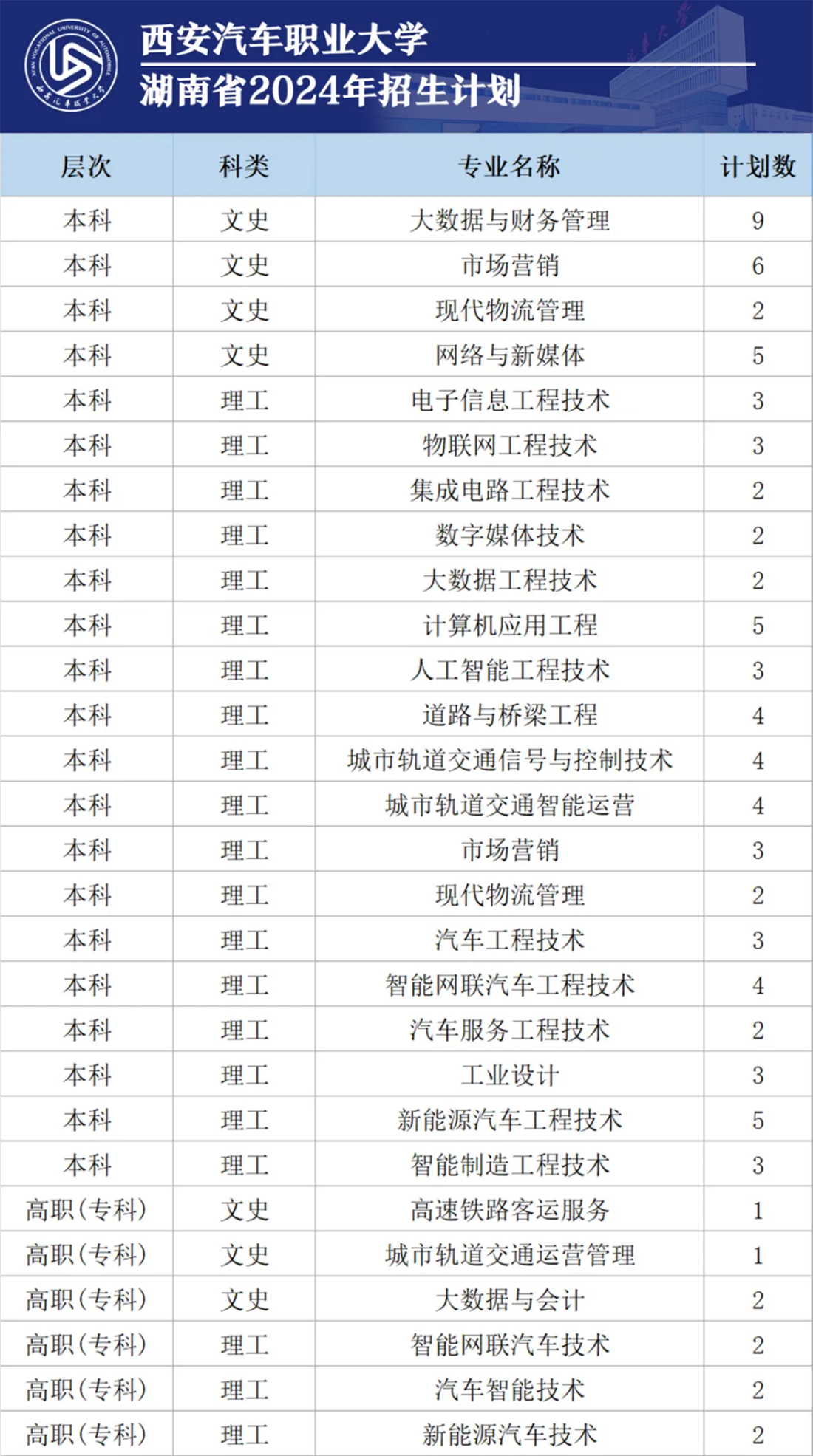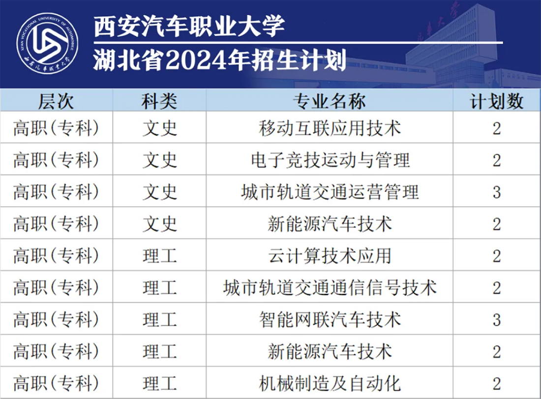 西安汽车职业大学-2024年招生计划(湖北、湖南、广东、广西、海南、重庆、四川、贵州)
