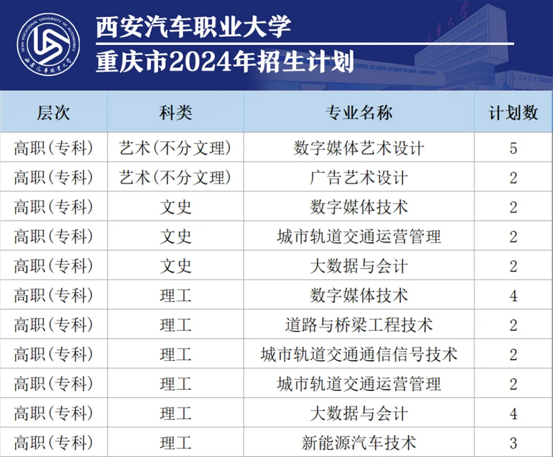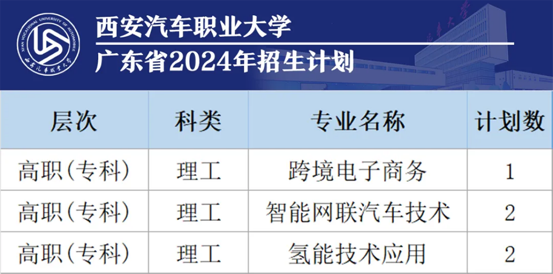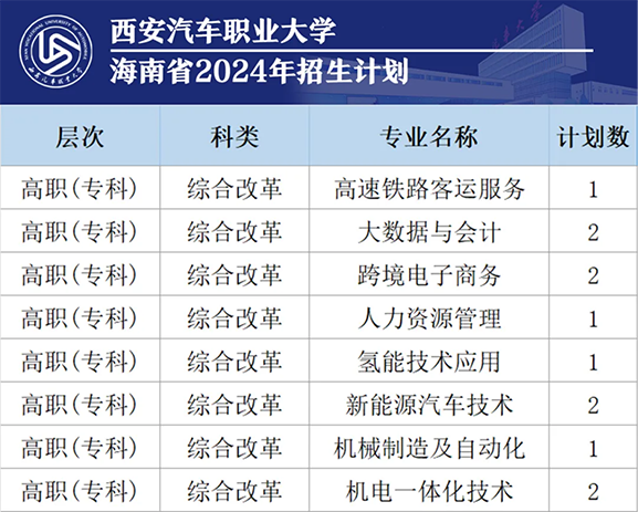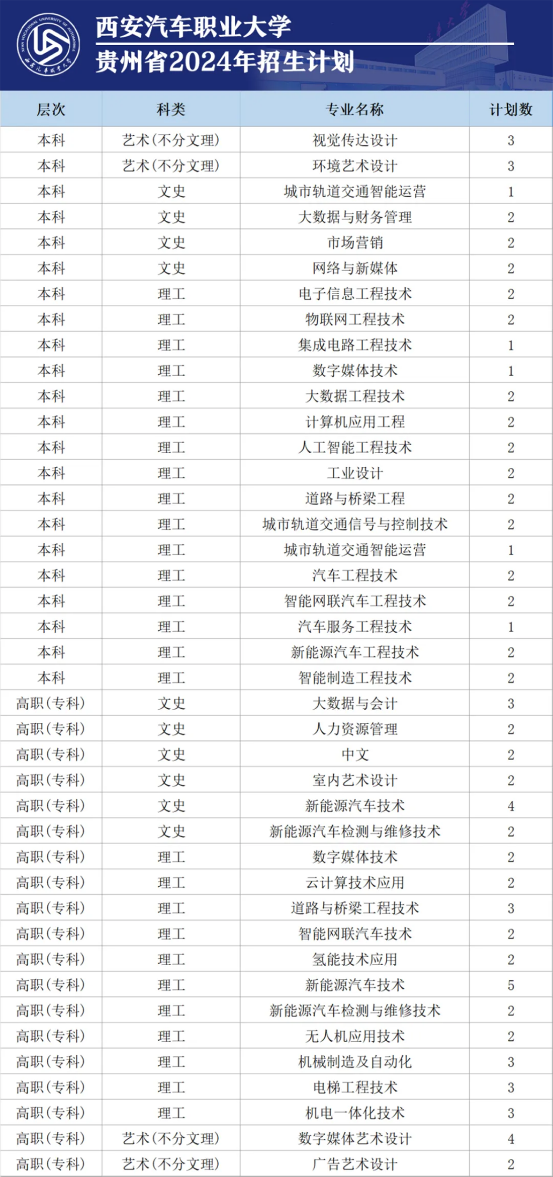 西安汽车职业大学-2024年招生计划(湖北、湖南、广东、广西、海南、重庆、四川、贵州)