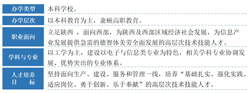办学以来,学校以教育报国为使命,为党育人,为国育才。学校已经成为一个以信息类专业为特色,适应新兴产业和行业发展的高层次技术技能人才培养基地。学校全面贯彻党的教育方针,始终坚持社会主义办学方向,以立德树人为己任,职业面向国家重大战略需要和陕西经济社会发展需求,培养现代信息产业卓越工程师。在2023陕西教育年度典范评选中,我校荣获“陕西高校综合实力奖”和“陕西就业竞争力示范高校”。