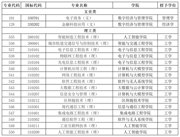 学校对接产业高端和高端产业,聚焦“新工科”,新一代信息产业,先进制造业和现代服务业等重点领域发展需求,开设专业以工科为主,涵盖了电子与信息、财经商贸,装备制造、交通运输4个专业大类8个专业类,现有27个本科专业,23个专升本专业,40个专科专业,形成了10大特色学科专业群,所设置的软件工程技术、人工智能工程技术、集成电路工程技术、区块链技术、金融科技应用等27个本科专业人才培养特色鲜明,是区域经济和信息产业发展不可替代急需紧缺的。