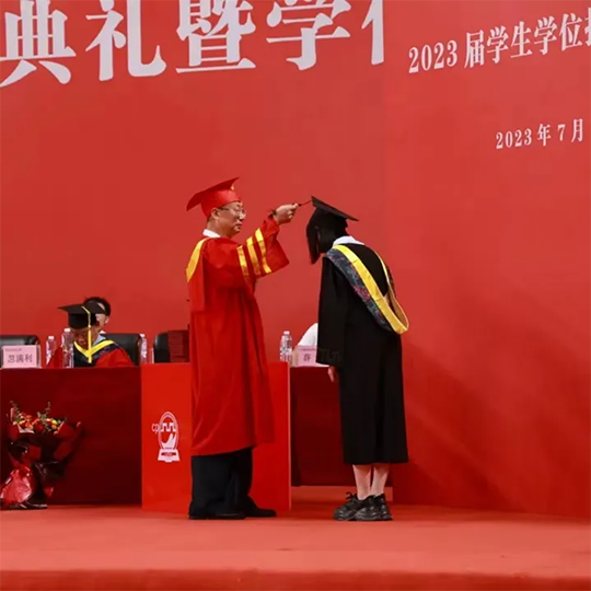 学校理事长、校长张明为获得学士学位的毕业生代表拨穗