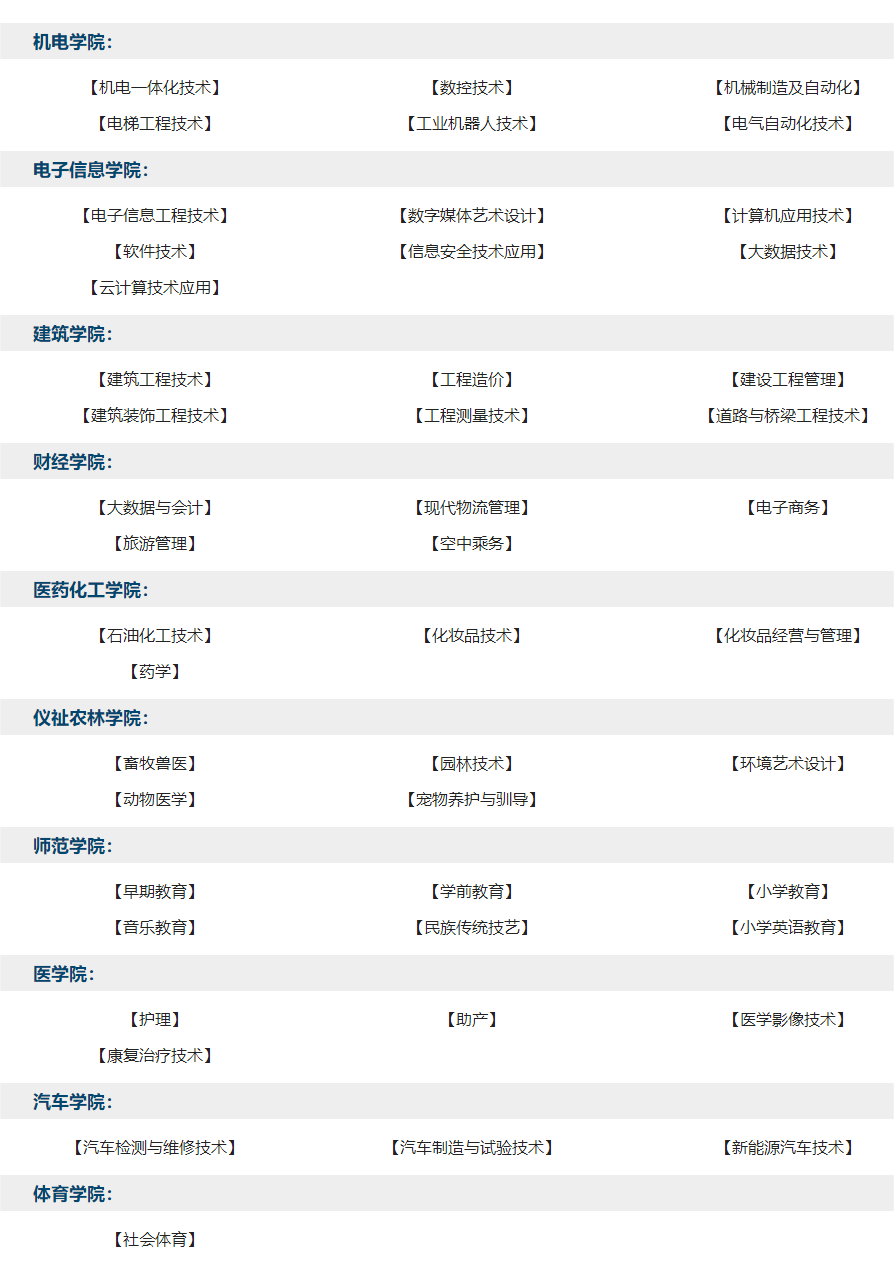 设:护理、医学影像技术、康复治疗技术、护理(涉外)、英语教育、学前教育、早期教育、音乐教育、小学教育、建筑工程技术、建设工程管理、工程造价、道路桥梁工程技术、工程测量技术、建筑装饰工程技术、航空物流、电子商务、旅游英语、物流管理、会计、空中乘务、旅游管理、电子信息工程技术、计算机应用技术、计算机信息管理、软件技术、大数据技术与应用、数字媒体艺术设计、应用电子技术专业、药学、石油化工技术、应用化工技术、化妆品经营与管理、油气储运技术、环境艺术设计、宠物养护与驯导、园林技术、畜牧兽医、汽车检测与维修技术、汽车检测与维修技术(中德合作办学)、新能源汽车技术、汽车营销与服务、汽车营销与服务(中德合作办学)、民族传统技艺等52个专科专业。