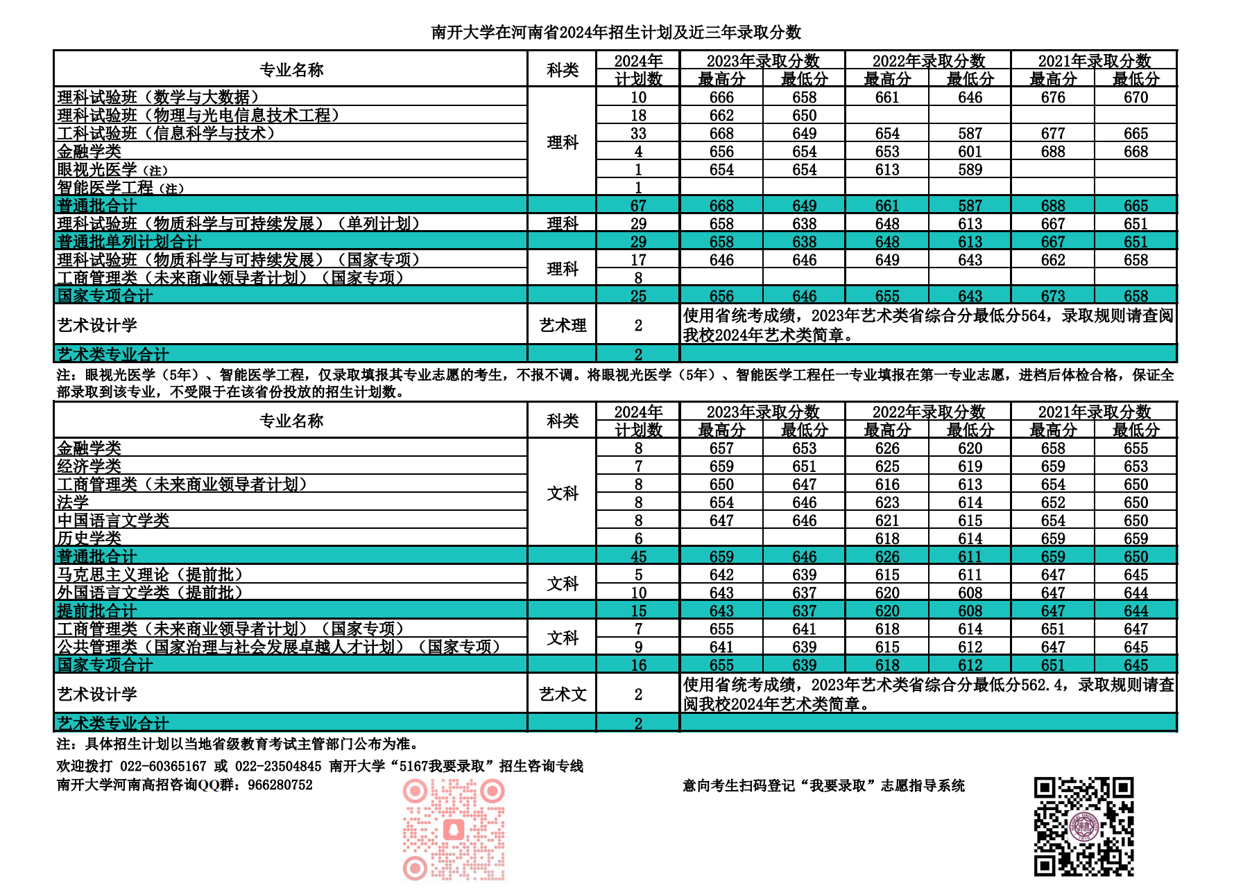 2024年 : 南开大学在河南省2024年招生计划及近三年录取分数