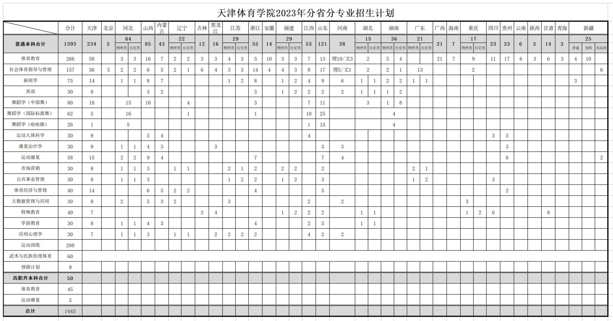 2023年 : 天津体育学院-2023年分省分专业招生计划