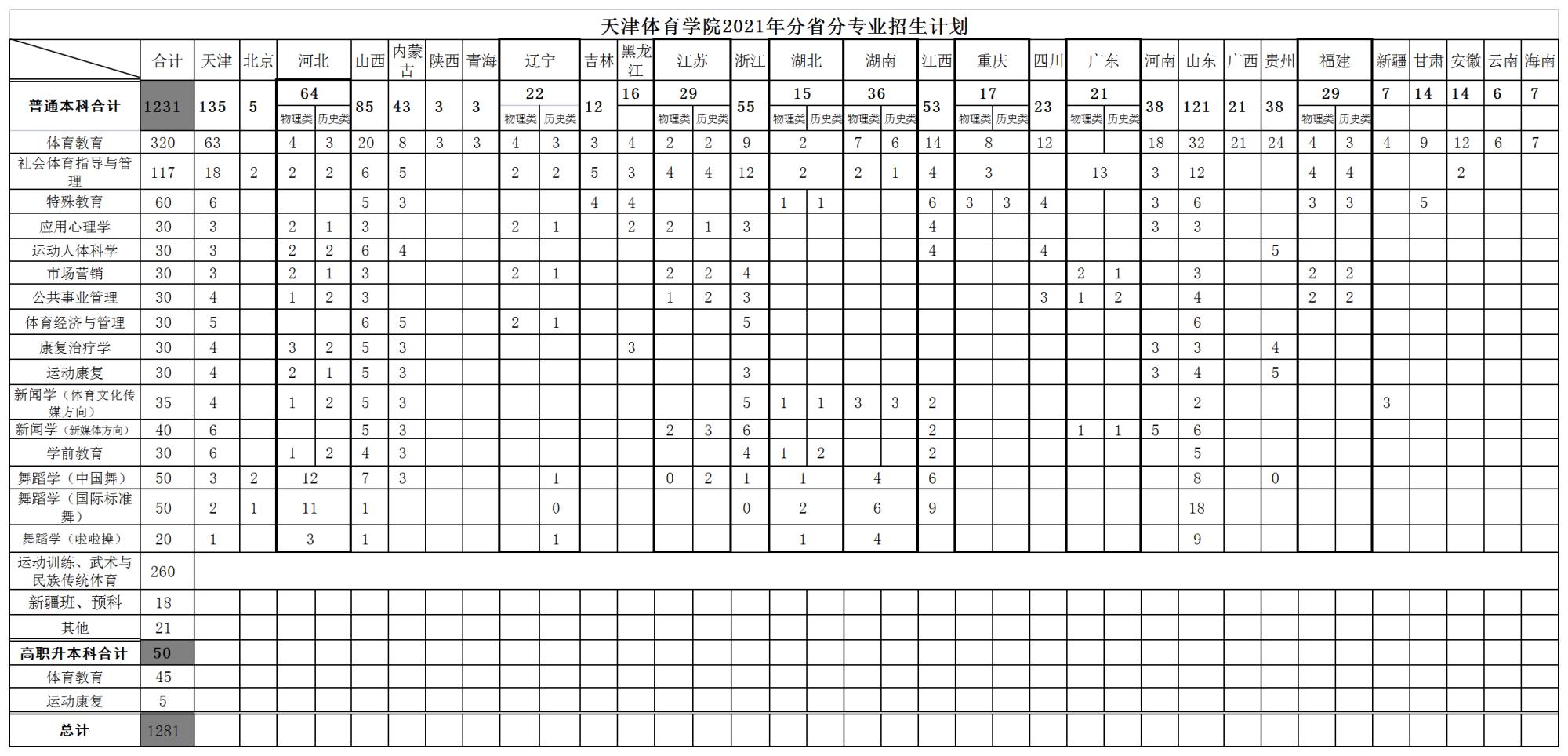 2021年 : 天津体育学院2021年分省分专业招生计划