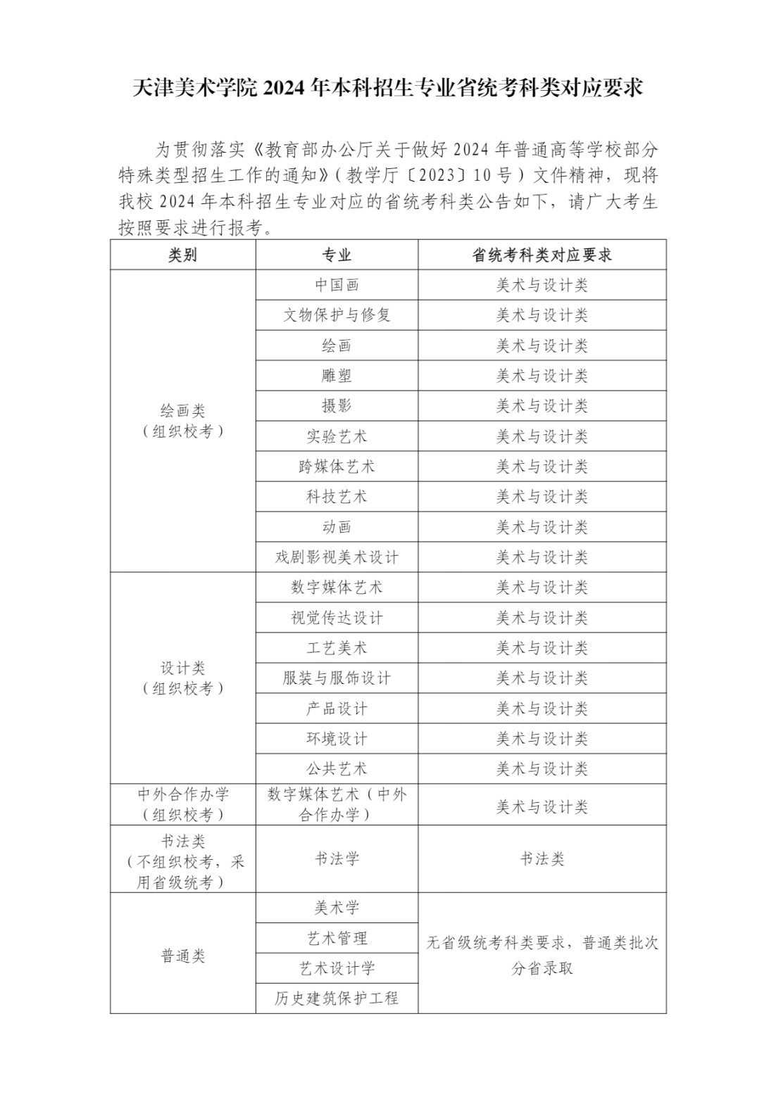 2024年 : 天津美术学院2024年本科招生专业省统考科类对应要求