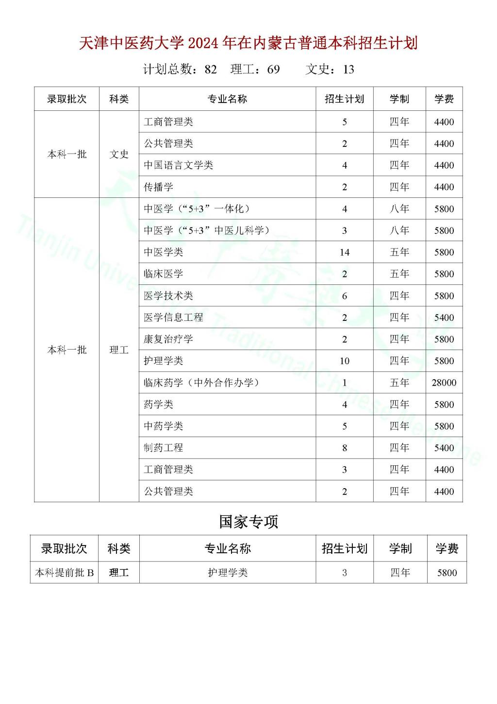 2024年 : 天津中医药大学-2024年在黑龙江省 / 内蒙古普通本科招生计划