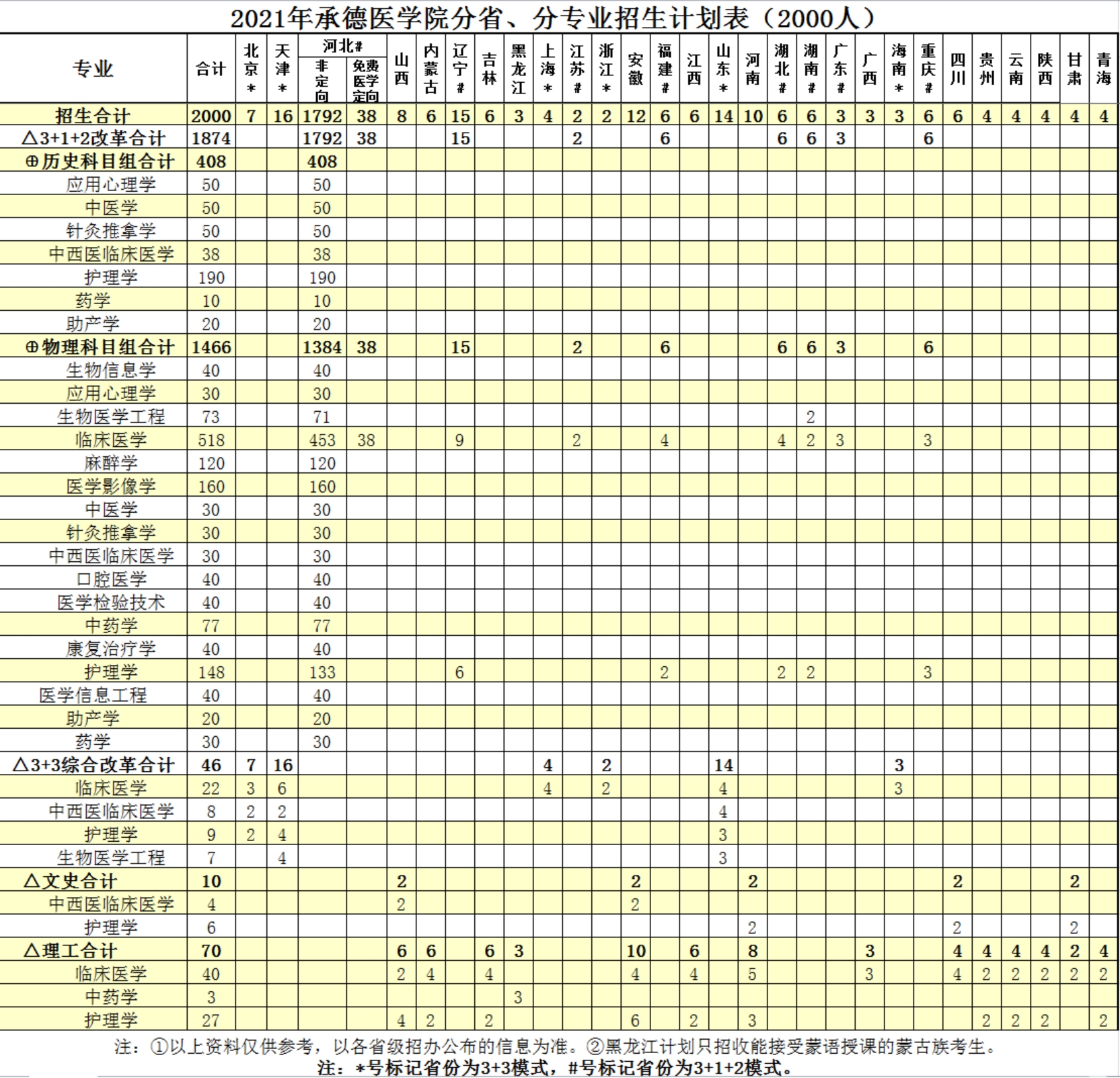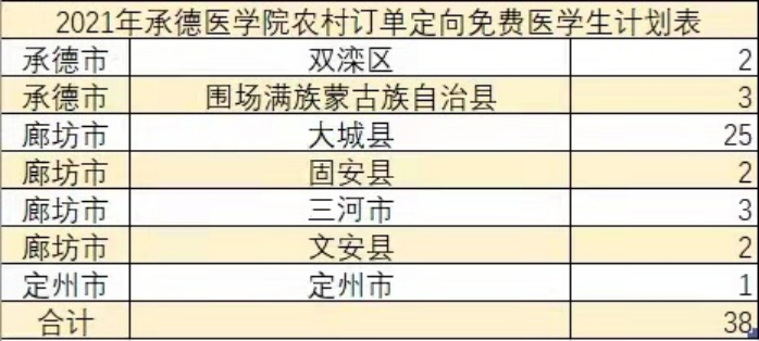 表2:2021年承德医学院农村订单定向免费医学生计划表