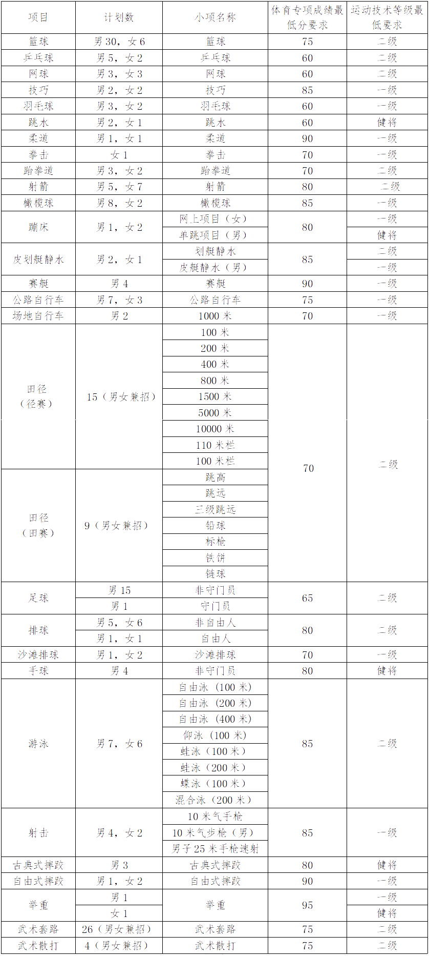 (一)我校依据招生项目计划、运动员技术等级要求和运动队建设需求,分项目划定体育专项考试成绩最低录取控制线。