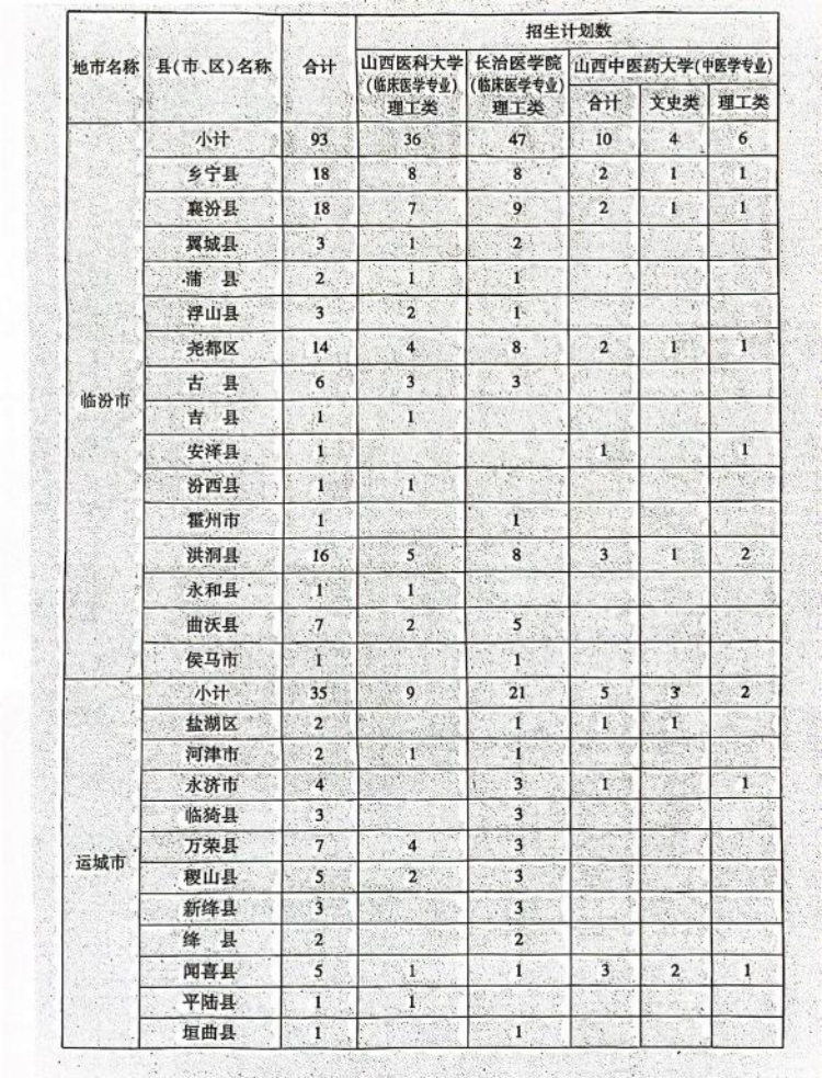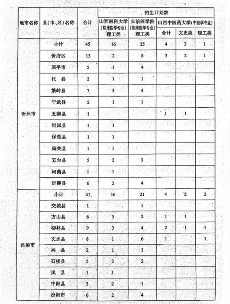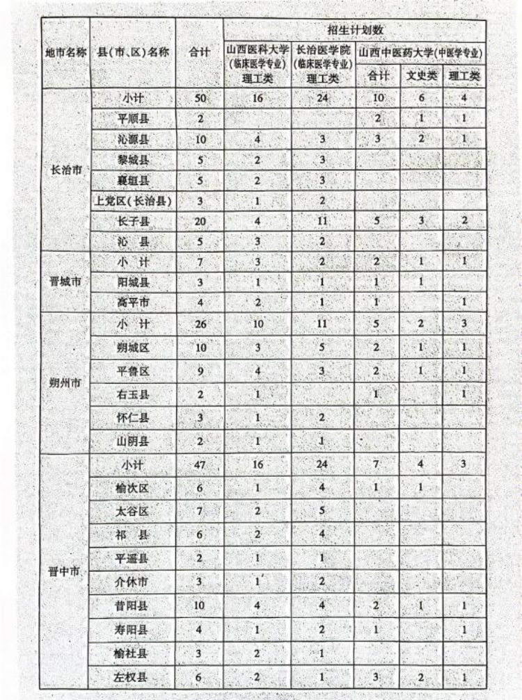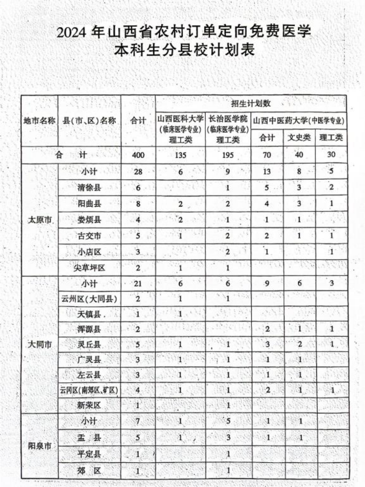 2024年 : 长治医学院-2024年山西省农村订单定向免费医学本科生分县校计划表