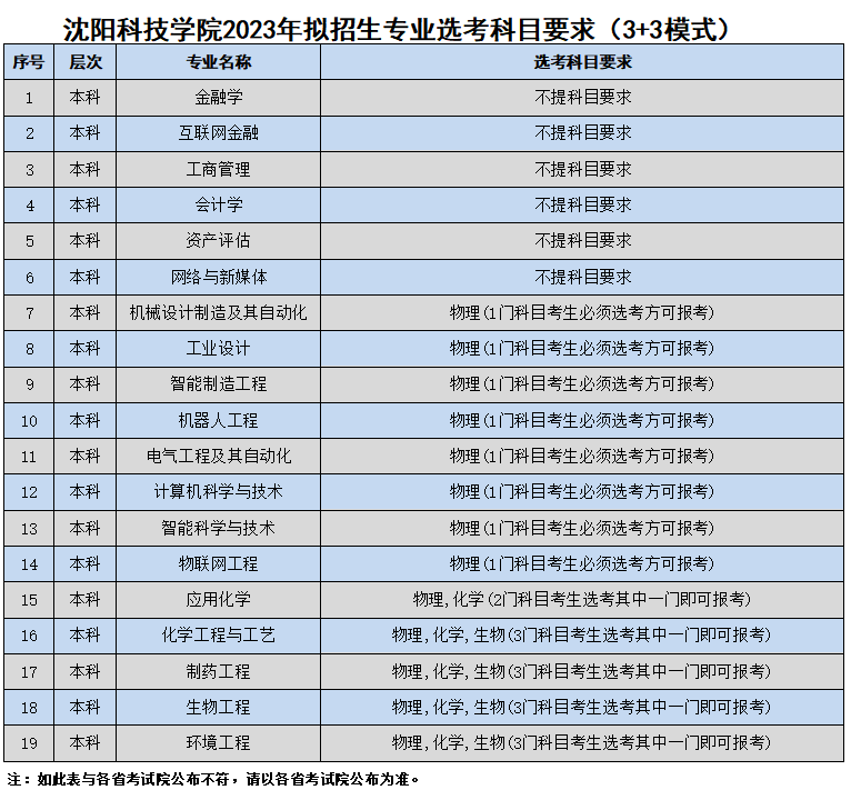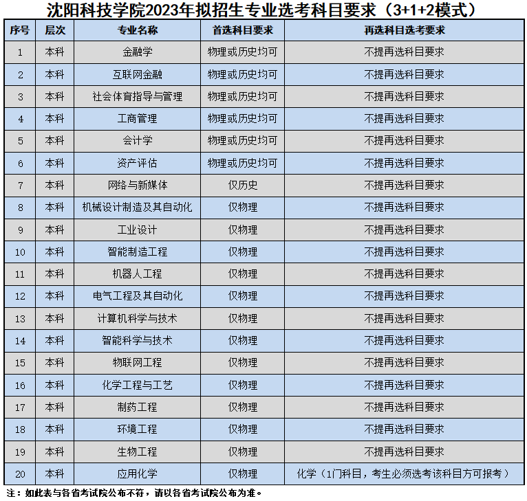 沈阳科技学院2023年拟招生专业选考科目要求(3+3模式)