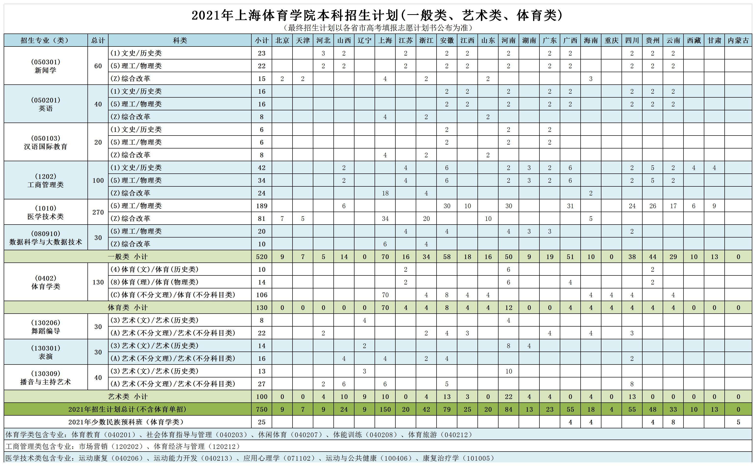 2021年 : 上海体育学院2021年本科招生计划(一般类、艺术类、体育类)