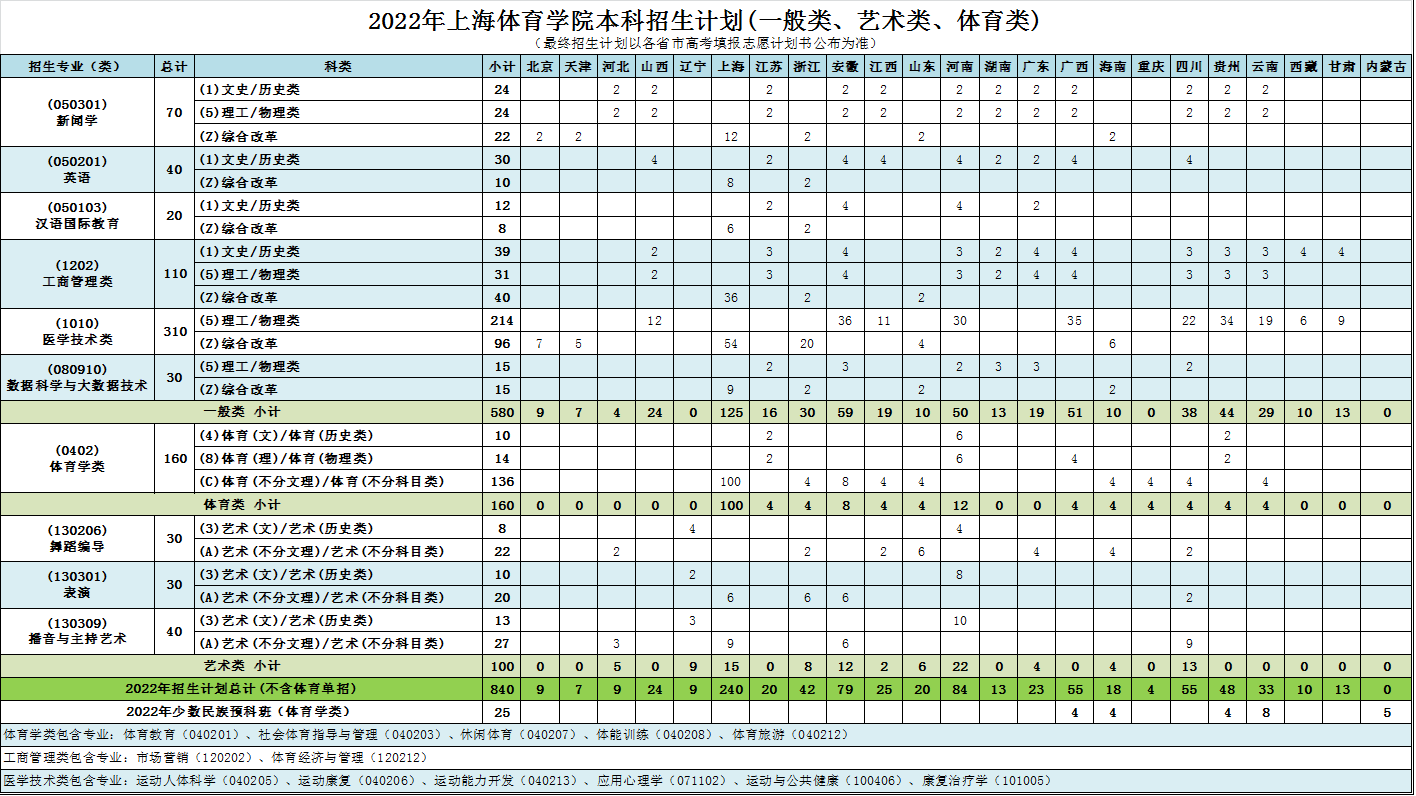 2022年 : 上海体育学院2022年本科招生计划(一般类、艺术类、体育类)