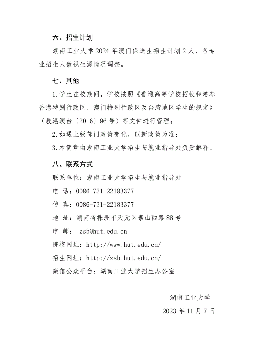 湖南工业大学2024年联合招收华侨港澳台学生简章