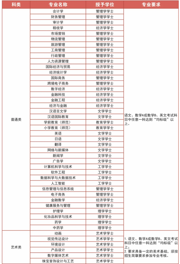 会计学、财务管理、审计学、税收学、汉语言文学、汉语国际教育、学前教育、小学教育、网络与新媒体、新闻学、广告学、英语、日语、国际经济与贸易、经济统计学、国际商务、金融科技、金融工程、经济与金融、市场营销、物流管理、旅游管理、工商管理、行政管理、人力资源管理、计算机科学与技术、软件工程、数据科学与大数据技术、信息管理与信息系统、电子商务、健康服务与管理、护理学、中药学、化妆品科学与技术 |